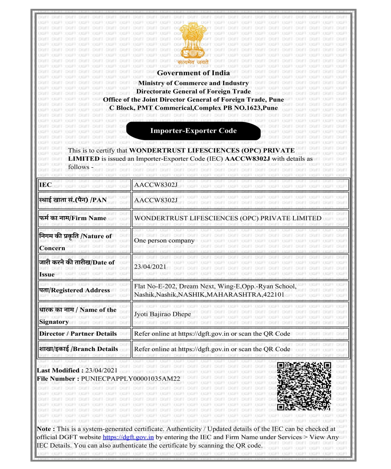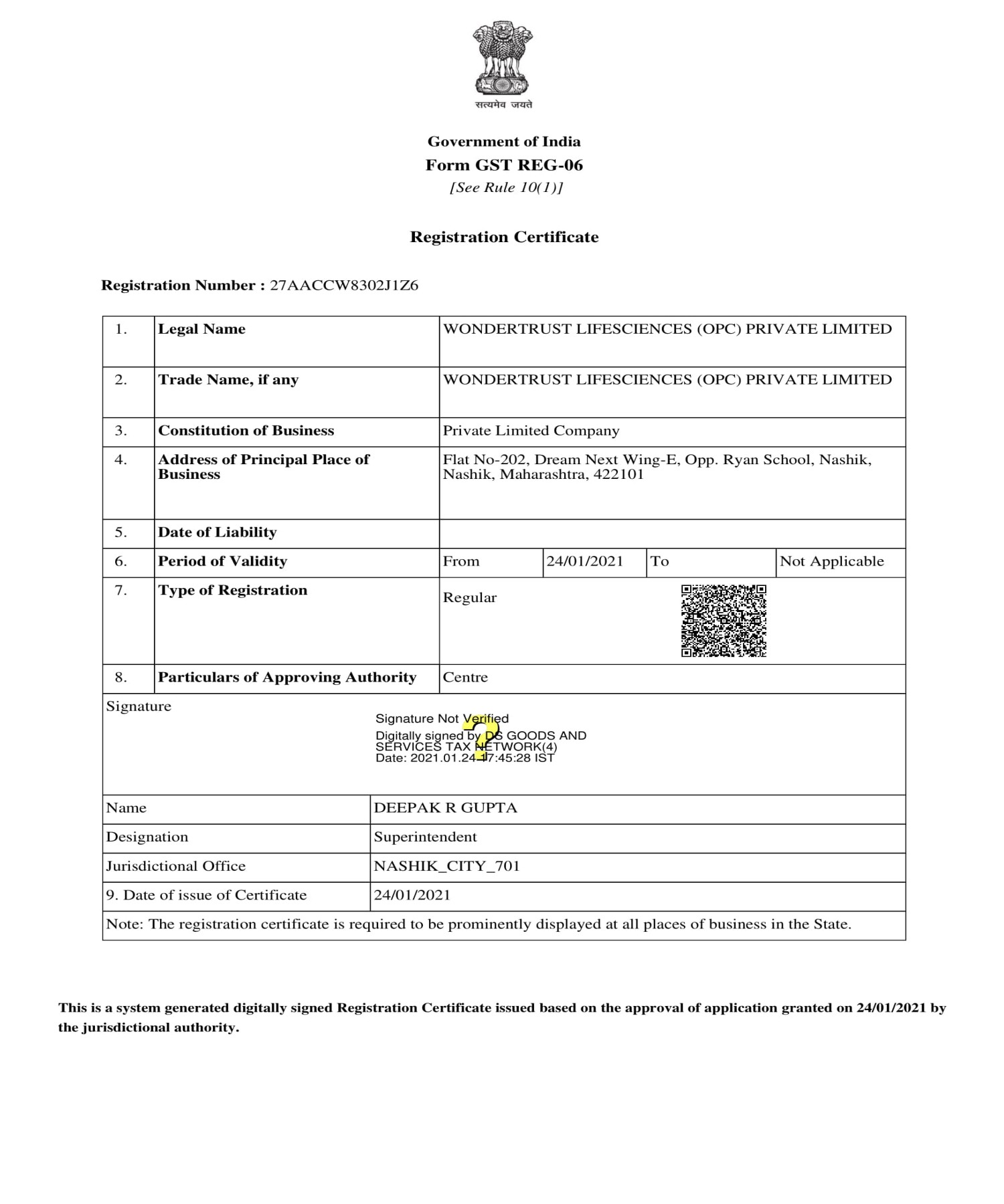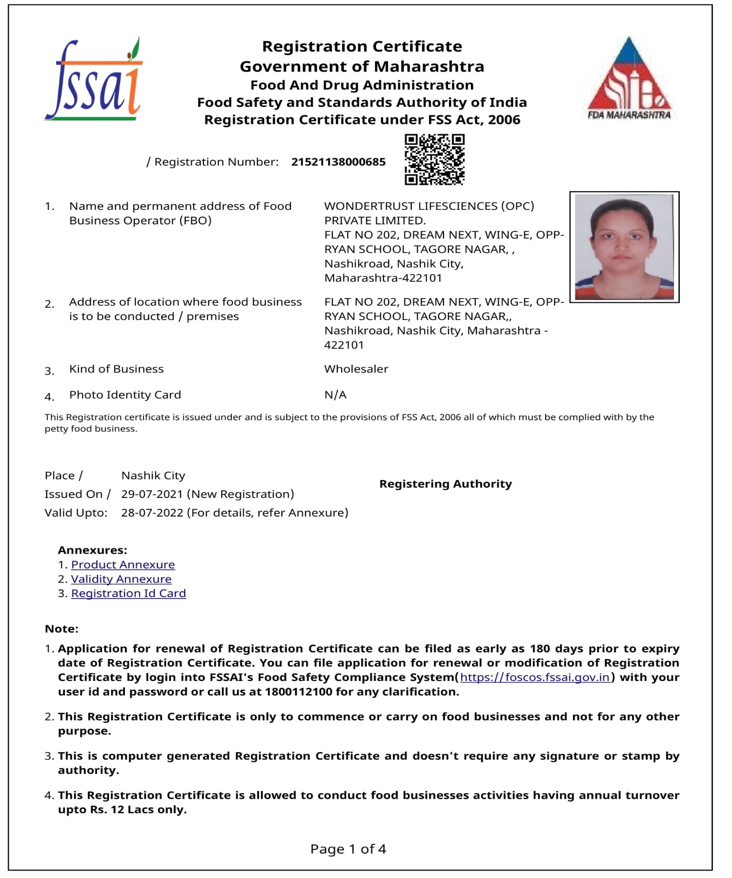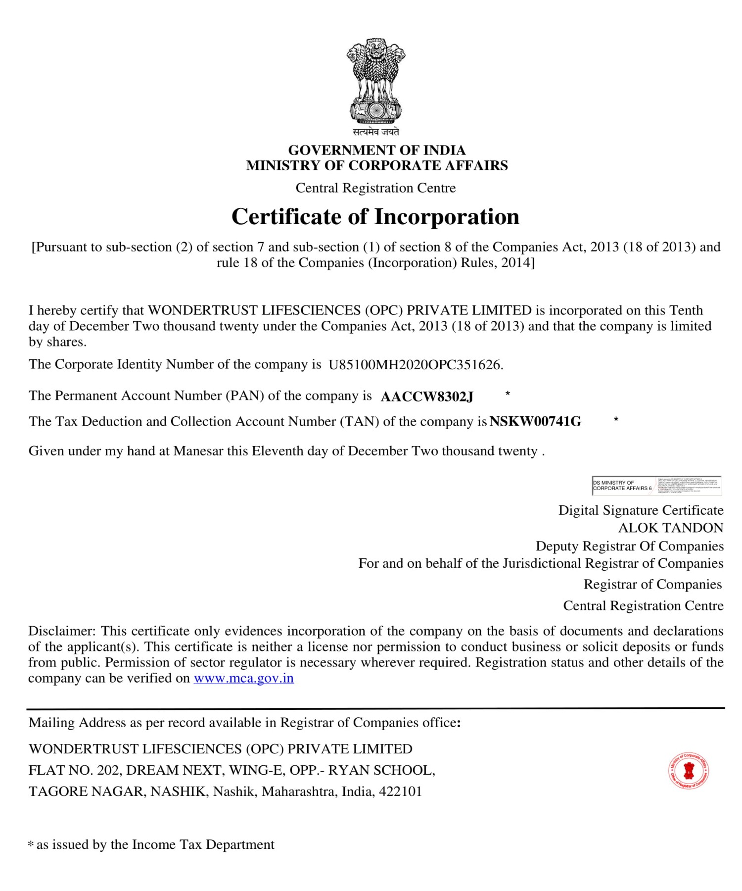 it gives immense pleaseure to introduce "Wondertrust Lifesciences Pvt. Ltd." an organisation with the concept of serving the societyby providing "Quality Medicines that too at affordable price".According to the section 7 of Companies(Incorporation) rule 2014 "Wondertrust Lifesciences Private Limited" is incorporated by Ministry of Corporate Affairs, Government of India on 11 December 2020.